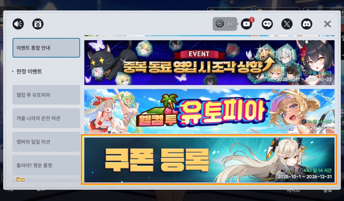 1️. 게임 내 로비 좌측에 있는 [이벤트] 아이콘을 클릭해주세요.