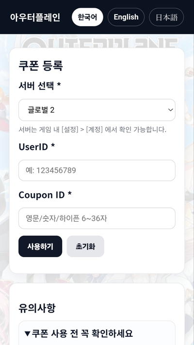 – 로그인 없이 쿠폰 사용 시, 반드시 게임 내 서버와 UID를 확인 후 입력해주세요.