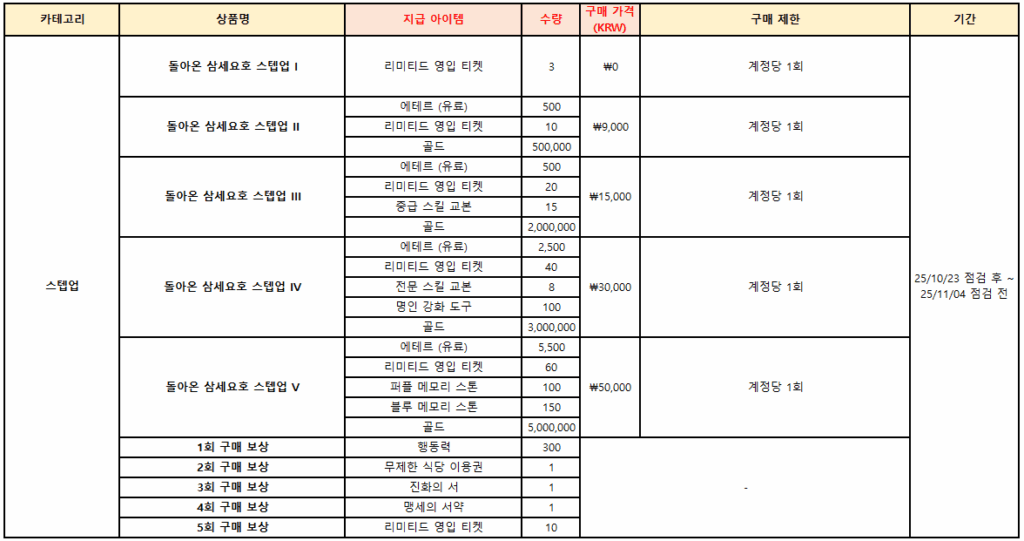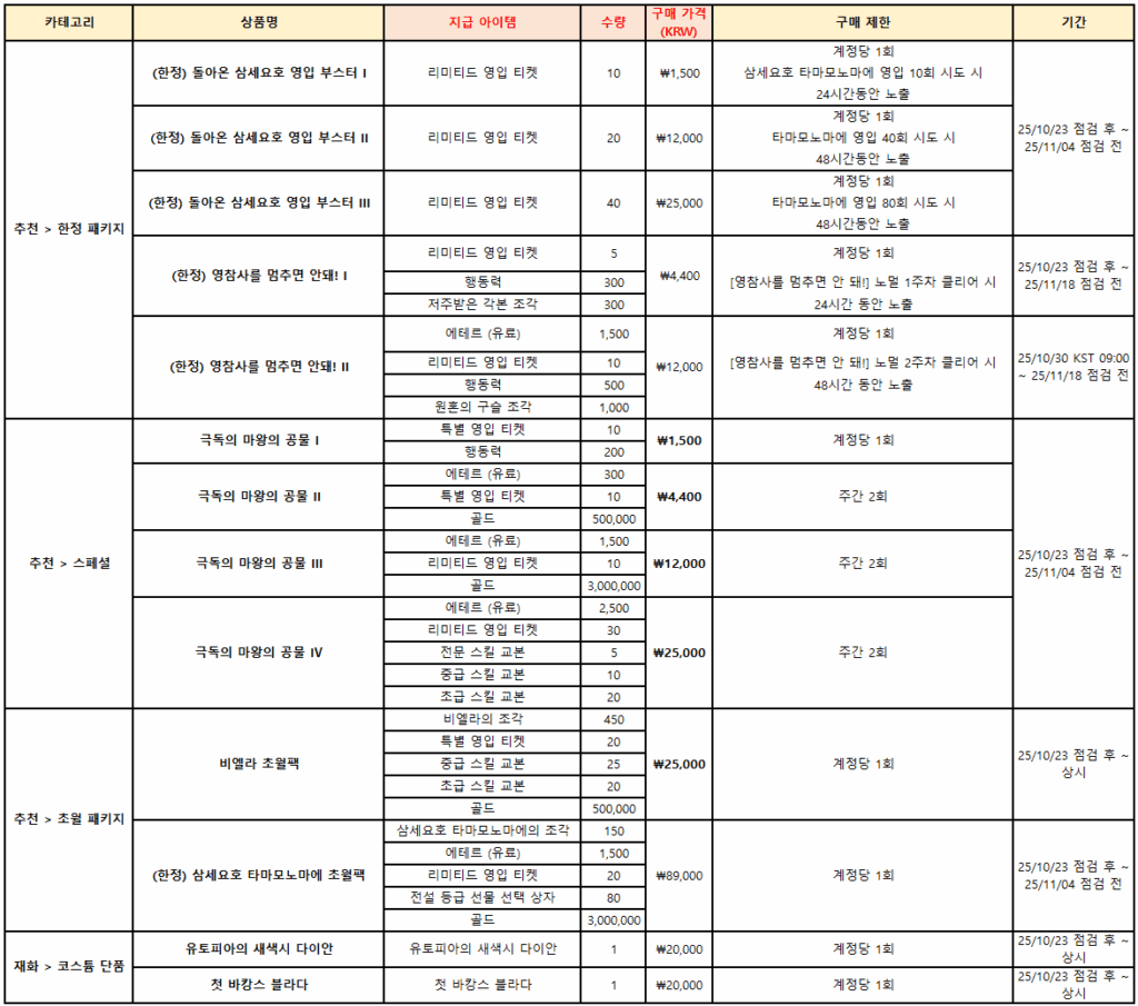 | 카테고리 | 상품명 | 판매 가격 | 구매 제한 | 구매 기간 |
