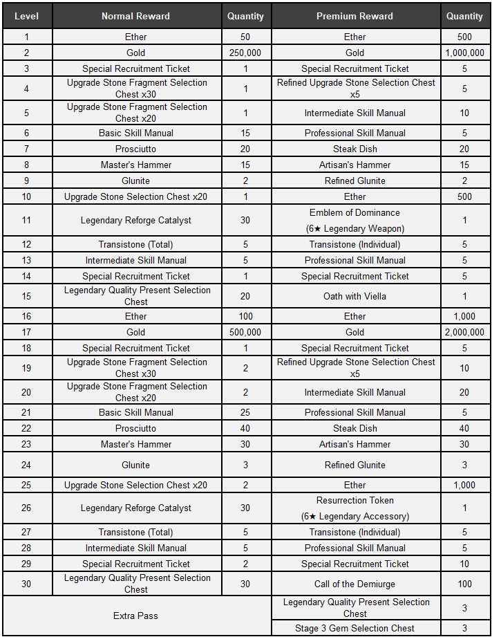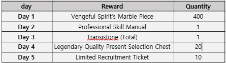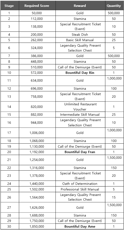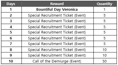 2) Rewards will be given in-game based on the number of times you have performed Seasonal Recruitment, as shown in the table below: