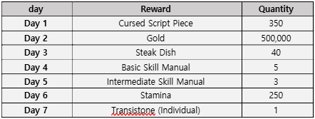 | 100,000 Gold | Cursed Script Piece | 100 | One-time | 10 | |