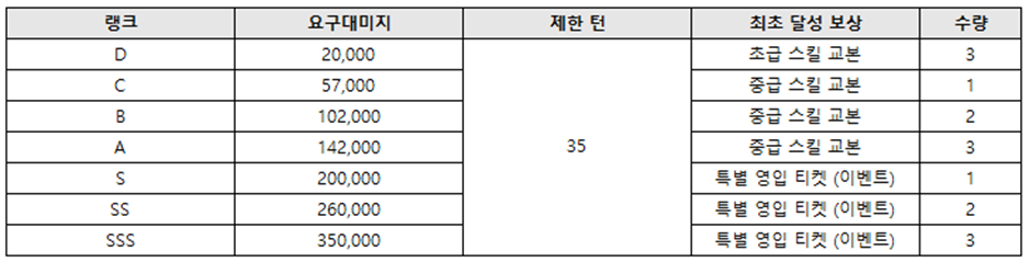– 달성한 데미지량에 따라 랭크를 부여받고, 최초 달성 보상을 획득할 수 있습니다. (1일 1회 도전 가능)