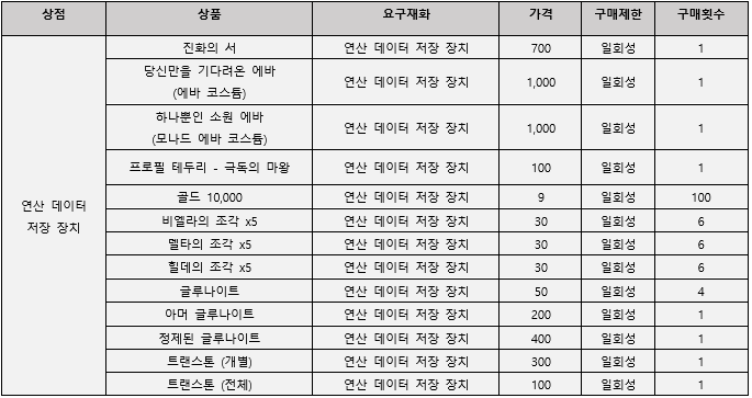 | 미션 | 필요 코인 | 보상 | 수량 | 구매 제한 | 구매 기간 |