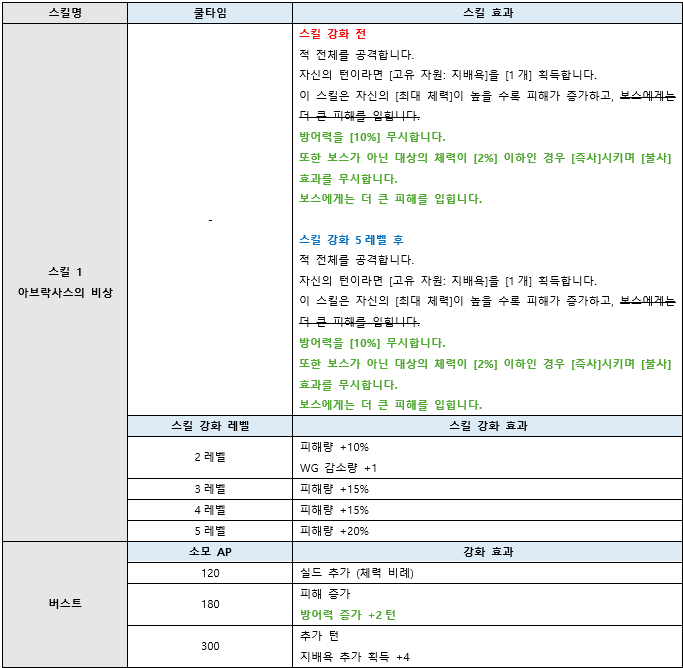 | 버스트 스킬 | 소모 AP | 강화 효과 |