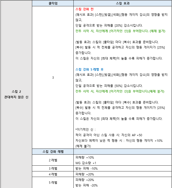 | 4레벨 | 스킬 쿨타임 -1턴 피해량 + 20% | |