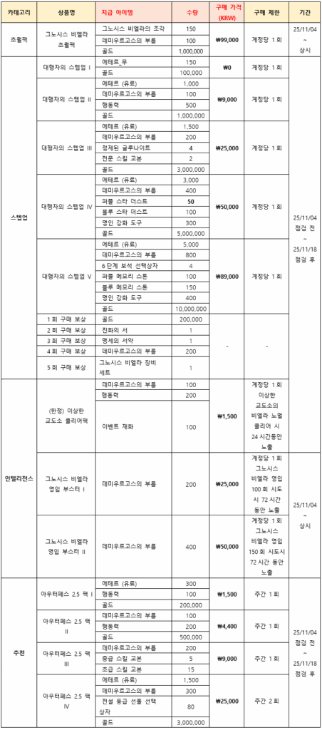| 교환소 | 1 | 골드 | 100,000 | 일 2회 | 25/11/04(화) 점검 후 ~ 25/12/02(화) 점검 전 |