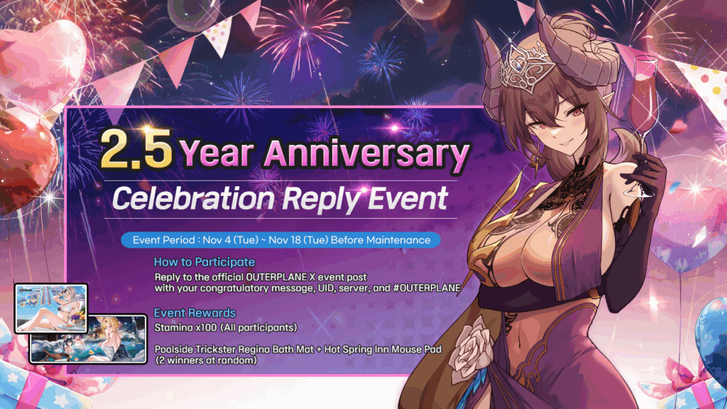 Celebrate OUTERPLANE’s 2.5-Year Anniversary with your warm messages and don’t miss out on the special rewards! 💫