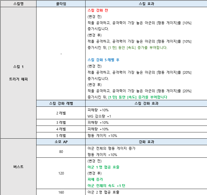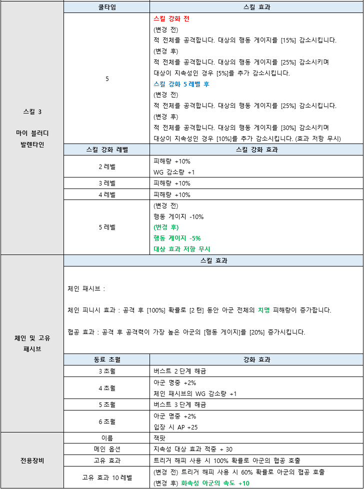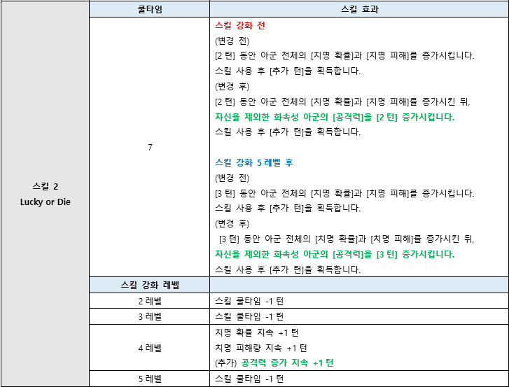 | 흡혈 | 흡혈량 변경 | 적에게 입힌 피해의 일정 비율만큼 회복합니다. 회복량은 자신의 최대 체력 20%를 초과할 수 없습니다. | 적에게 입힌 피해의 일정 비율만큼 회복합니다. 회복량은 자신의 최대 체력 25%를 초과할 수 없습니다. | ||