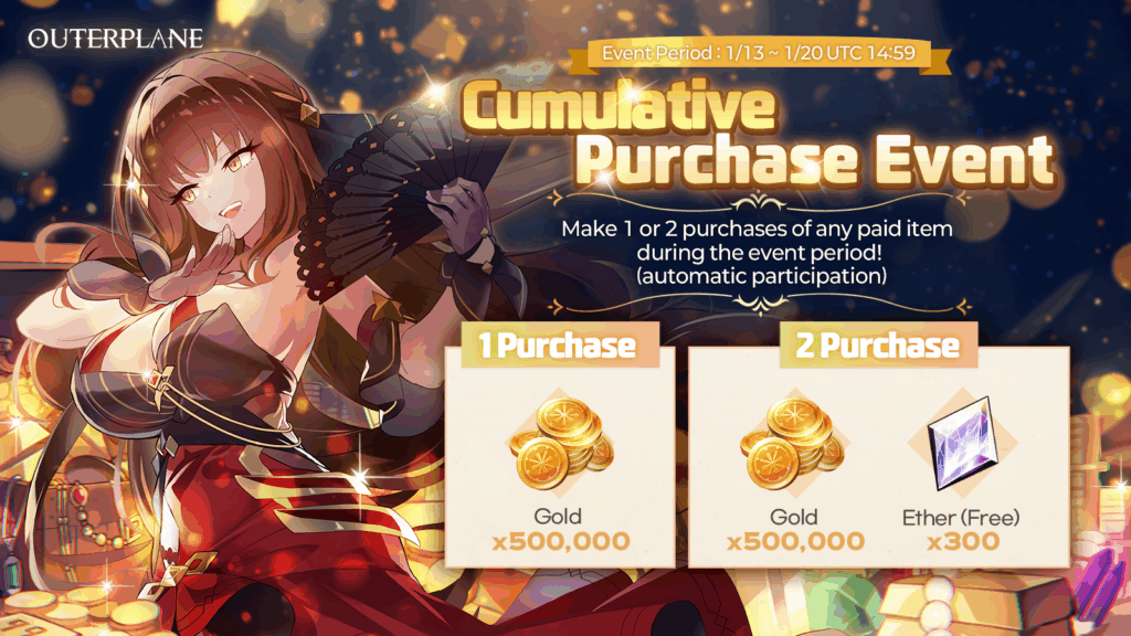 – 2 Purchases: Gold ×500,000 + Free Ether ×30 (Includes the 1-purchase reward)