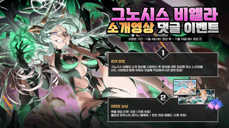 스킬 타이밍 RPG, 아우터플레인 안녕하세요, GM 아메입니다! 새로운 데미우르고스 동료 ‘그노시스 비엘라’의 소개 영상을 감상하고, 여러분의 소감을 댓글로 남겨주세요! [이벤트…
